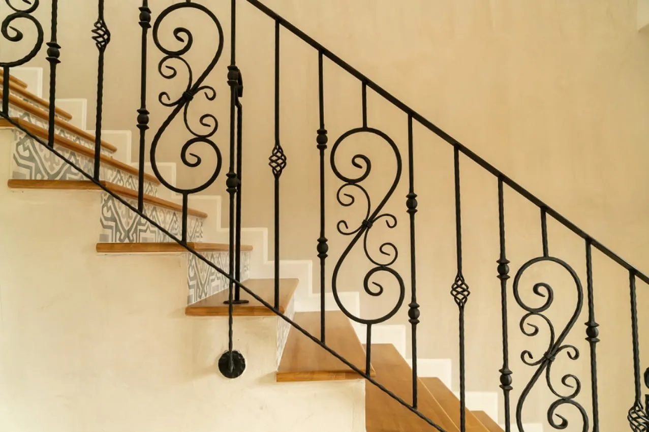Главная роль в дизайне отведена гармоничному союзу материалов. Теплый, золотистый оттенок ступеней из бука создает ощущение уюта, в то время как перила из кованого металла добавляют композиции строгости и изысканности. Изящные декоративные узлы на балясинах подчеркивают тонкую ручную работу, а деликатный орнамент на подступенках вносит в дизайн нотку эксклюзивности и завершенности.